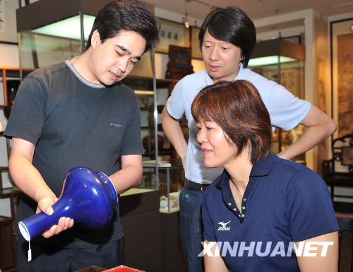 8月28日,美國女排主教練郎平(左)在古玩城查看瓷器。