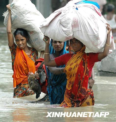 9月7日,孟加拉國博格拉地區(qū)的婦女在洪水中行進。孟加拉國一官員當日稱,由于洪災情況嚴重,使得該國至少60萬人受困,大約1.4萬人進入救援中心避難。新華社/法新