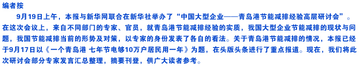 我第一次到青島港,可以用三個詞來形容我的感受,那就是榮幸、振奮和感動。對于青島港的節(jié)能減排工作,我個人認為有幾個特點。第一就是把節(jié)能減排融入企業(yè)的管理理念,上升到企業(yè)文化建設的高度。這種財富對整個社會的貢獻也許要比產(chǎn)品和利潤大得多。第二個特點就是點點滴滴都要抓,把節(jié)能減排工作貫穿到企業(yè)的全過程中去。青島港的節(jié)能減排不是一種獨立的工作,而是一種貫穿到企業(yè)發(fā)展過程中的工作。從企業(yè)發(fā)展戰(zhàn)略到企業(yè)社會責任,再到各項工作任務和崗位的考核體系,青島港各個方面都很健全。第三個特點就是以人為本,發(fā)揮全員的聰明才智抓節(jié)能減排。我們在上次的調(diào)研中注意到,青島港的節(jié)能減排是以全體職工為基礎的,它首先征集了10000多條建議,再發(fā)動職工投入到節(jié)能減排的發(fā)明創(chuàng)造中去,其中學良節(jié)油法等一大批以職工名稱命名的節(jié)能減排技術成為青島港節(jié)能減排工作的一大亮點。[詳情] |