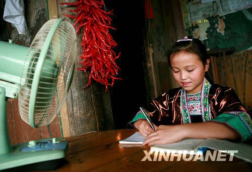 9月23日,在廣西融水苗族自治縣桿洞鄉(xiāng)黨鳩苗寨,一位苗族小女孩在電風扇旁溫習功課。國慶前夕,位于黔桂交界處大苗山深處的廣西融水縣桿洞鄉(xiāng)黨鳩苗寨用上了電網(wǎng)電。桿洞鄉(xiāng)位于大苗山深處摩天嶺山脈,此前主要靠山村小水電供電。 | |