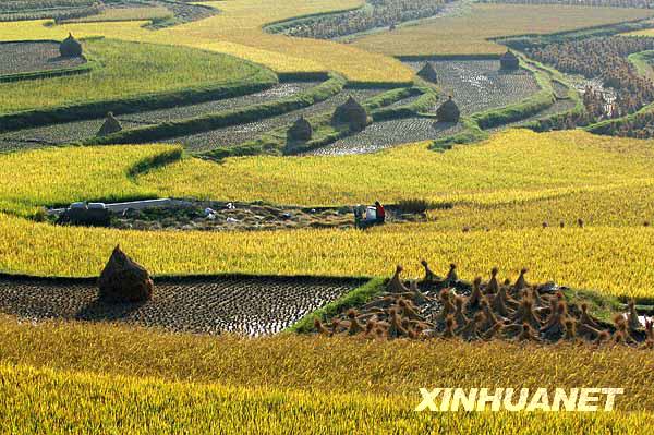 10月7日在貴陽市花溪區(qū)高坡鄉(xiāng)拍攝的稻田。眼下貴陽已進(jìn)入秋糧收割高峰期,農(nóng)民們正利用好天氣加緊搶收稻谷,顆粒歸倉。 | |