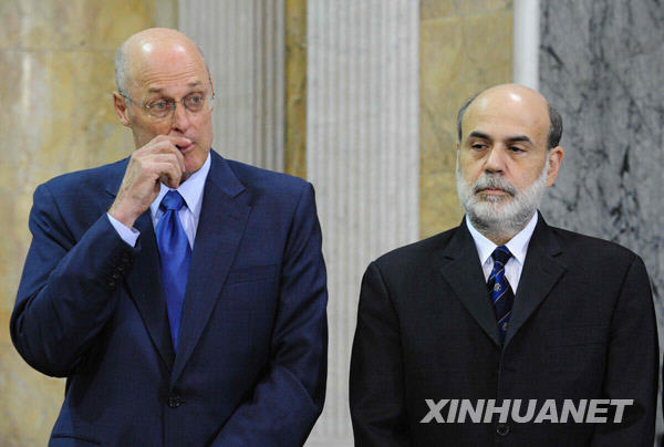 10月14日,美國(guó)財(cái)長(zhǎng)保爾森(左)和美聯(lián)儲(chǔ)主席伯南克在華盛頓出席聲明會(huì)。