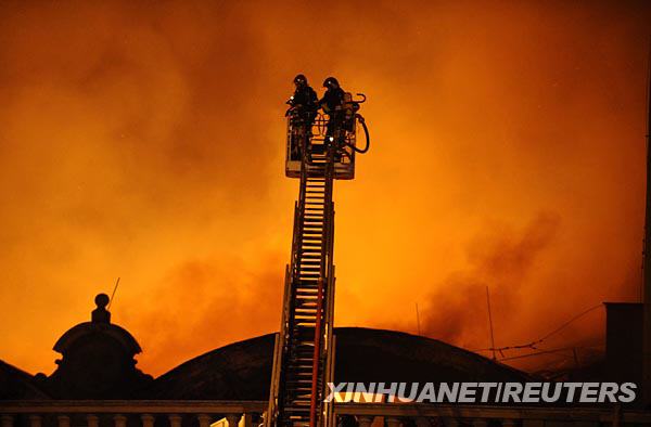 10月16日,在捷克首都布拉格的工業(yè)宮,兩名消防員登上云梯救火。新華社/路透