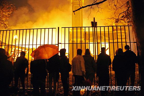 10月16日,在捷克首都布拉格,路人站在火光沖天的工業(yè)宮外圍觀。新華社/路透