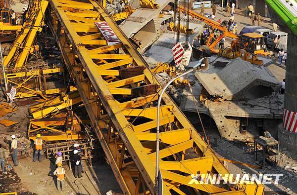 10月19日,在印度首都新德里市郊,施工人員對(duì)一處在建輕軌高架橋工地的事故現(xiàn)場(chǎng)進(jìn)行清理。