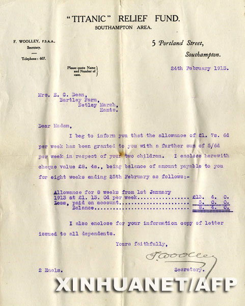 這張由亨利·奧爾德里奇父子拍賣行發(fā)布的照片顯示的是“泰坦尼克”號(hào)救濟(jì)基金會(huì)寄給米莉維娜·迪恩的賠償信。