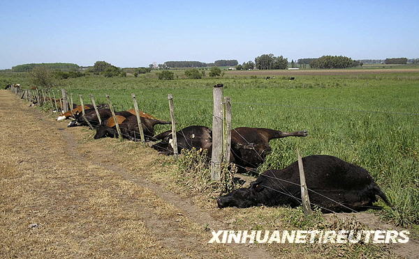 10月22日,在烏拉圭首都蒙得維的亞西南80公里的一個(gè)農(nóng)場(chǎng),一些死牛躺在地頭。該農(nóng)場(chǎng)經(jīng)理發(fā)現(xiàn)飼養(yǎng)的52頭牛離奇死亡,經(jīng)過(guò)獸醫(yī)檢查,證實(shí)這些牛是在放牧?xí)r被閃電擊中而死的。新華社/路透