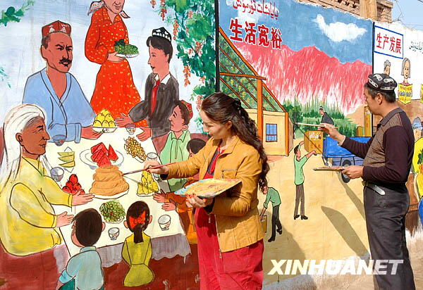10月27日,兩名繪畫愛(ài)好者在吐魯番市亞爾鄉(xiāng)東門村繪制“文化墻”。