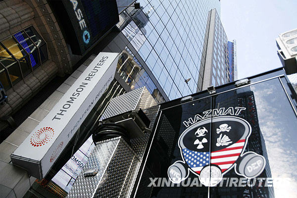 10月27日,一輛危險(xiǎn)物品處置車(chē)停在美國(guó)紐約路透社編輯部外。路透社在紐約的編輯部當(dāng)天收到裝有白色粉末的信件,全部人員隨后撤離辦公室。 新華社/路透