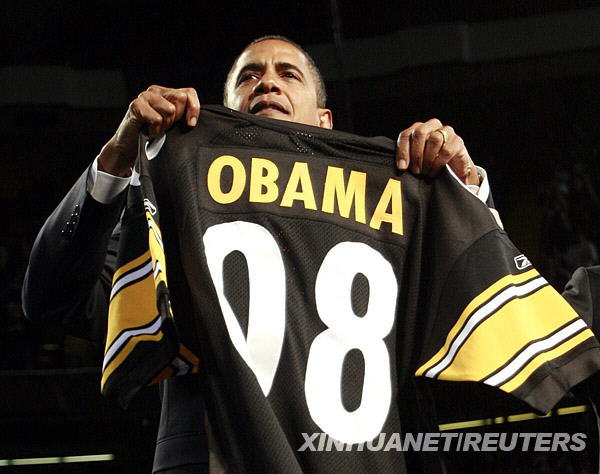 10月27日,在美國賓夕法尼亞州的匹茲堡,美國民主黨總統(tǒng)候選人奧巴馬在競(jìng)選集會(huì)活動(dòng)中接受當(dāng)?shù)亻蠙烨蜿?duì)主席贈(zèng)送的“08”號(hào)球衣。新華社/路透