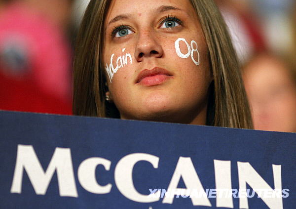 10月27日,在美國俄亥俄州的代頓,一名臉上寫著“麥凱恩08”字樣的女子參加共和黨總統(tǒng)候選人麥凱恩的競(jìng)選集會(huì)。新華社/路透