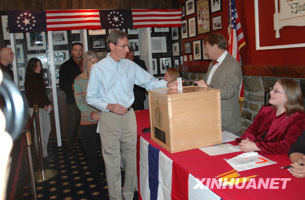11月4日,在美國新罕布什爾州北部的迪克斯維爾山口小鎮(zhèn),人們排隊投票。當(dāng)?shù)貢r間11月4日零點(北京時間4日13時)左右,新罕布什爾州兩個小鎮(zhèn)迪克斯維爾山口和哈特的選民率先開始投票,標(biāo)志著4年一度的美國大選投票正式開始。