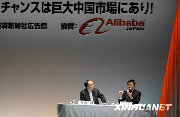 11月11日,在日本首都東京,阿里巴巴集團董事局主席馬云(右)和日本軟銀集團董事長孫正義向日本企業(yè)介紹中國網(wǎng)絡(luò)商務(wù)的發(fā)展情況。當天,阿里巴巴日本株式會社舉行面向日本企業(yè)的大型說明會,吸引了上千名日本企業(yè)代表和相關(guān)人士參加。阿里巴巴集團計劃從2009年開始與日本軟銀集團合作,為中國消費者提供專門經(jīng)營日本商品的網(wǎng)絡(luò)服務(wù)。 |
