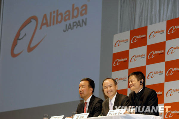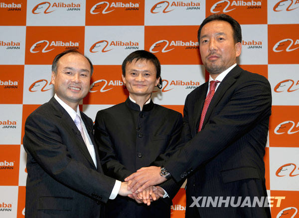 11月11日,在日本首都東京,阿里巴巴集團董事局主席馬云(右)和日本軟銀集團董事長孫正義(中)以及阿里巴巴日本株式會社董事長香山誠(左)共同出席說明會。 | |