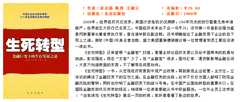 瘋狂的糧價(jià):全球漲3倍,中國怎么辦? 瘋狂的石油價(jià)格:四年漲七倍 中長期通貨膨脹趨勢:生死抉擇只在一念間? 通貨膨脹的副產(chǎn)品:銀根緊縮與資金成本上升 金融變局下的企業(yè)經(jīng)營最高法則