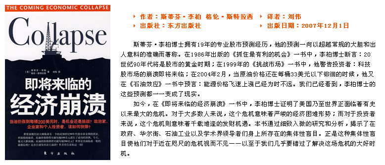 最大限度地發(fā)揮風(fēng)能的作用 利用液化天然氣 其他替代性能源 未來(lái)的汽車 應(yīng)對(duì)能源危機(jī)的一個(gè)萬(wàn)無(wú)一失的投資組合 財(cái)富和生存:其實(shí)它們是一回事兒 參考書目 |