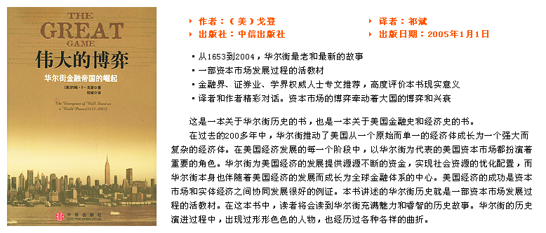《偉大的博弈》或許可以向正在現(xiàn)代化道路上匆匆前行的中國提供一個歷史的參照。對于那些希望從華爾街的歷史中獲得借鑒的中國讀者來說,本書是一本有重要參考價值的書。 《偉大的博弈》或許可以為正在現(xiàn)代化道路上匆匆前行的中國提供一個歷史的參照。在過去的200多年中,美國作為一個新興國家,成功地超越了歐洲列強,而華爾街在這一過程中的核心作用,無疑是這段歷史風(fēng)云向世人昭示的最重要的啟示之一。在近幾十年里,全球高科技產(chǎn)業(yè)迅速崛起,成為世界經(jīng)濟發(fā)展的新動力,而這些高科技產(chǎn)業(yè)的興起在很大程度上也得益于華爾街的發(fā)現(xiàn)和推動。因此,對于全世界的經(jīng)濟學(xué)家和歷史學(xué)家,華爾街的歷史是一個永遠研究不盡的題目,而對于正在發(fā)展和轉(zhuǎn)型中的中國,它更具有非,F(xiàn)實的借鑒意義。 ——祁 | |