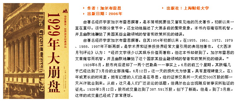 由著名經(jīng)濟(jì)學(xué)家加爾布雷思撰著,是本簡(jiǎn)明扼要但又富有見(jiàn)地的歷史著作,初版以來(lái)一直在重印。該書(shū)部分章節(jié)中,還生動(dòng)地描述了大蕭條前的繁榮景象。本書(shū)內(nèi)容雍容而機(jī)智,并且幽默地鞭撻了美國(guó)某些金融領(lǐng)域的智者和政策所犯的錯(cuò)誤。