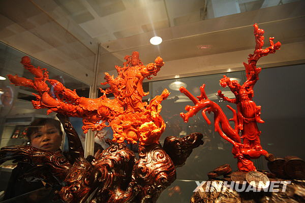 這是展出的天然紅珊瑚雕作品《送子觀音》(左)和《紅財神樹》(11月13日攝)。