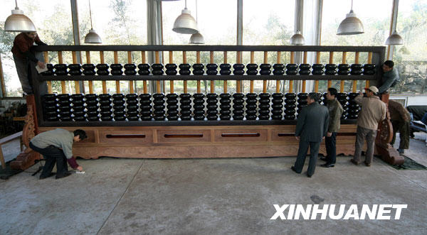 11月13日,工人對(duì)剛裝配完畢的巨型算盤進(jìn)行最后的整理。