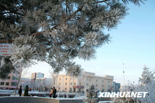 11月17日在富蘊縣街頭拍攝的霧凇。當(dāng)日,新疆富蘊縣氣溫降至零下10攝氏度左右,出現(xiàn)霧凇美景。