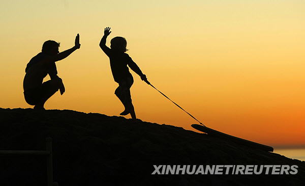 11月17日,夕陽(yáng)西下,在美國(guó)加利福尼亞的月光海灘上,一個(gè)小男孩拖著他的沖浪板爬上小沙丘與爸爸擊掌。新華社/路透