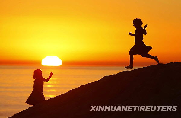 11月17日,夕陽(yáng)西下,孩子們?cè)诿绹?guó)加利福尼亞的月光海灘上玩耍。新華社/路透