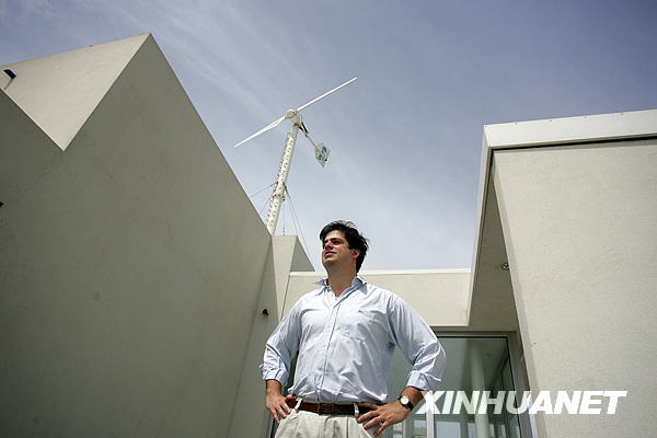 11月24日,在阿根廷海濱城市馬德普拉塔,“風(fēng)神大樓”的設(shè)計(jì)者之一佛朗哥·圖卡格尼站在大樓的風(fēng)力發(fā)電裝置前。 |