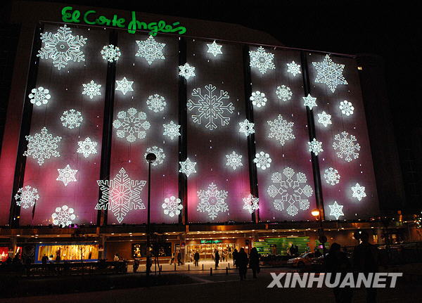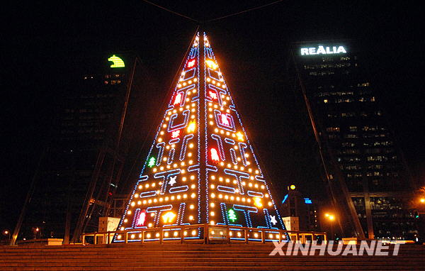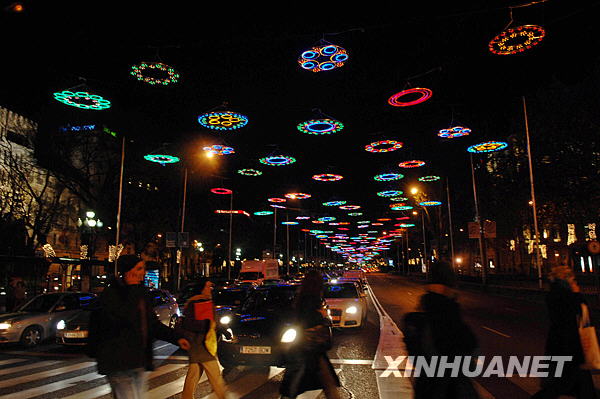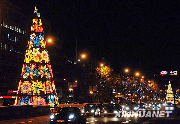 這是12月2日拍攝的西班牙首都馬德里著名建筑歐洲門(mén)前的圣誕樹(shù)燈飾。
