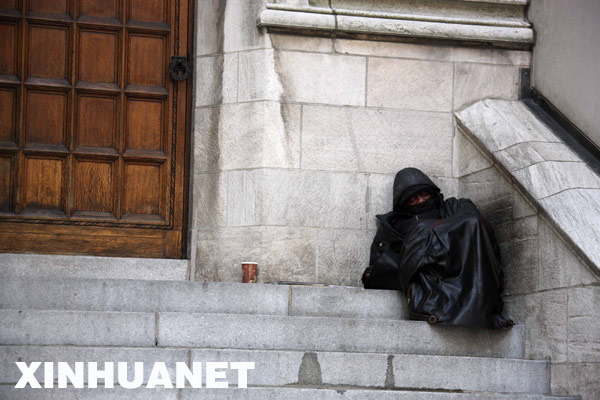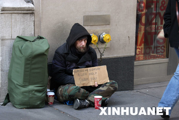 12月5日,美國(guó)勞工部公布的數(shù)據(jù)顯示,今年11月份美國(guó)非農(nóng)業(yè)部門就業(yè)崗位減少53.3萬(wàn)個(gè),為1974年12月份以來(lái)的最大減幅,失業(yè)率上升到6.7%,為15年來(lái)的最高點(diǎn)。這是11月11日,一名流浪漢在美國(guó)紐約曼哈頓街頭乞討。 |