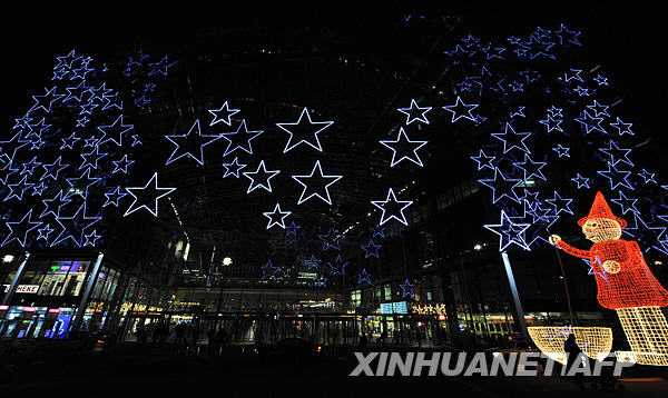 12月8日,德國(guó)柏林火車站的夜晚彩燈奪目。隨著圣誕節(jié)和新年的臨近,柏林的夜晚已被五光十色的節(jié)日彩燈裝飾得流光溢彩。新華社/法新