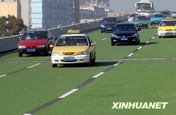 12月9日,車輛在武漢卓刀泉高架橋的綠色“跑道”上行駛。當日,湖北省武漢市卓刀泉高架橋通車。這條高架橋為武漢市首條彩色路面高架橋,路面采用了彩色陶瓷顆粒新型材料,具有防滑、耐磨、耐腐等特點。新華社發(fā)