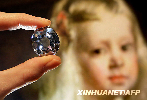 資料圖片:這枚鉆石輝映在一幅馬格麗塔·特雷莎的肖像畫前。新華社/法新 圖為一枚17世紀的灰藍色鉆石。這枚鉆石名為維特爾斯巴赫,重35.56克拉,曾是西班牙國王菲利普四世送給女兒馬格麗塔·特雷莎的嫁妝。10日,這枚鉆石由克里斯蒂拍賣行在倫敦拍賣,拍得1639萬英鎊(約合2430萬美元)的高價,成為世界上拍賣價格最高的鉆石。