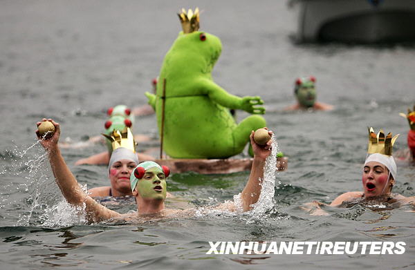 12月14日,在瑞士日內(nèi)瓦湖,身穿獨(dú)特服裝的選手參加第71屆“圣誕杯”冬泳比賽。新華社/路透
