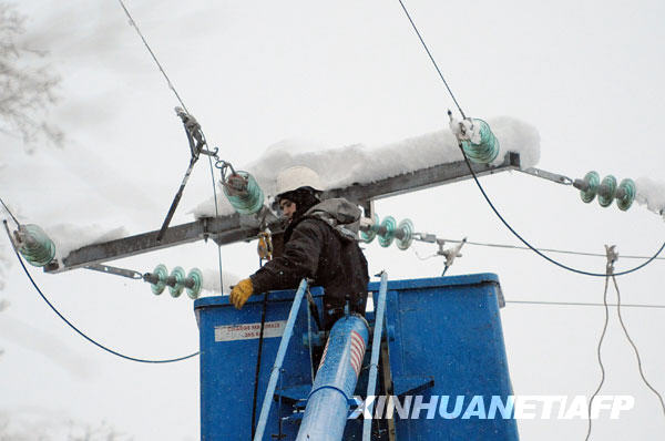 12月14日,一名電力工人在法國中部城市布拉薩克萊米訥搶修供電設(shè)備。新華社/法新