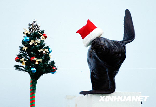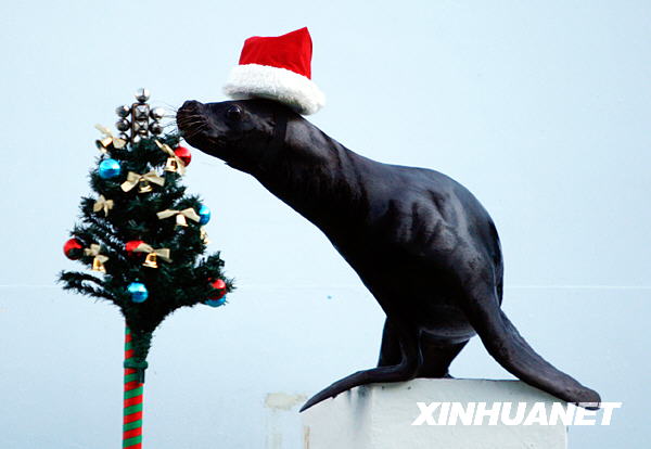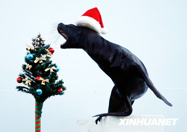 12月15日,在日本東京一家水族館,一頭海獅戴著圣誕老人的帽子,在一棵圣誕樹旁“載歌載舞”。