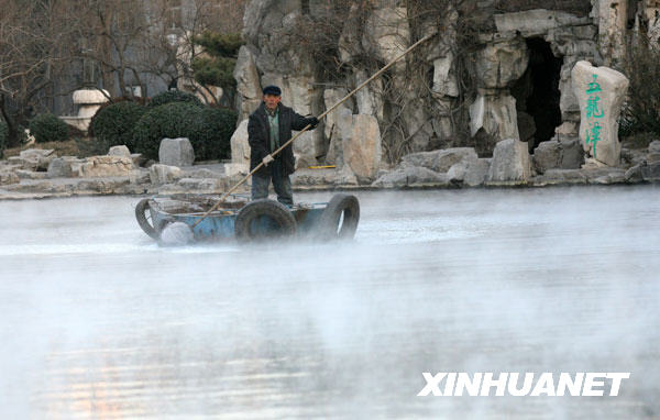12月22日,濟南五龍?zhí)丁霸旗F”繚繞。當日晨間,由于濟南市氣溫降至零下10攝氏度以下,趵突泉、黑虎泉、五龍?zhí)兜榷嗵幟霈F(xiàn)“云霧潤蒸”景觀。由于涌出的泉水溫度大大高于氣溫,泉池水面上形成“云霧”。