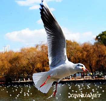 12月23日,一只紅嘴鷗爭(zhēng)得食物后在翠湖公園中飛翔。近日,據(jù)昆明市林業(yè)局統(tǒng)計(jì),由于昆明市生態(tài)環(huán)境不斷改善,2008年冬季到昆明越冬的紅嘴鷗數(shù)量達(dá)31700余只,同比增加700余只。