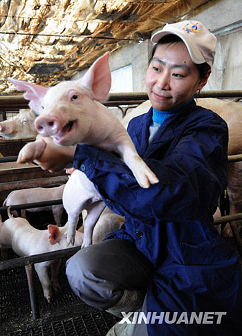 12月25日,天津薊縣建和養(yǎng)殖場(chǎng)場(chǎng)長(zhǎng)鄭娜在查看豬仔。2001年底,大學(xué)畢業(yè)一年多、在北京一家軟件公司任市場(chǎng)部經(jīng)理的北京女孩鄭娜,放棄了優(yōu)越的都市生活,來到天津薊縣東施古鎮(zhèn)南孟莊村她父親創(chuàng)辦的養(yǎng)豬場(chǎng)當(dāng)上“豬倌”。幾年來,在鄭娜的努力下,養(yǎng)殖場(chǎng)從最初仔豬存欄100頭,發(fā)展到存欄1000多頭,年產(chǎn)仔豬5000頭。她還建立起養(yǎng)豬信息網(wǎng),牽頭成立了養(yǎng)豬協(xié)會(huì),幫助當(dāng)?shù)仞B(yǎng)豬戶科學(xué)養(yǎng)殖,并生產(chǎn)出“無抗肉”銷往日本。現(xiàn)在,鄭娜正計(jì)劃用5年時(shí)間,把養(yǎng)豬場(chǎng)發(fā)展成為存欄萬(wàn)頭,集飼養(yǎng)、加工為一體的現(xiàn)代化生態(tài)園區(qū)。 | |