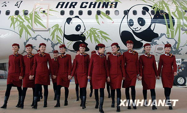 12月25日,國(guó)航西南分公司的空乘人員迎接“秀美四川”號(hào)彩繪飛機(jī)出廠。當(dāng)日,以水墨畫(huà)風(fēng)格噴涂大熊貓母子親密形象的第二架“秀美四川”號(hào)彩繪飛機(jī)在成都亮相。據(jù)悉,國(guó)航將使用兩架嶄新的“秀美四川”號(hào)A321彩繪飛機(jī)來(lái)執(zhí)行成都至臺(tái)北航線。