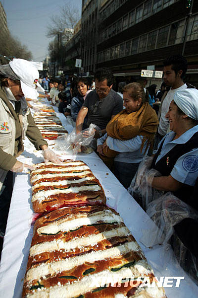 1月4日,市民在墨西哥城舉行的制作面包活動上等待工作人員分發(fā)面包。 當日,墨西哥國家面包工業(yè)商會在墨西哥城的11月20日大街舉行制作大面包活動。制作的面包長1600多米,重達1萬多公斤。制作這個大面包消耗了6600公斤面粉,3000公斤奶油,44000個雞蛋,1500升牛奶,2000公斤食糖等。共有2300人從4日凌晨3點開始制作,直到6點結(jié)束,耗資100萬比索(1美元約合13比索)。