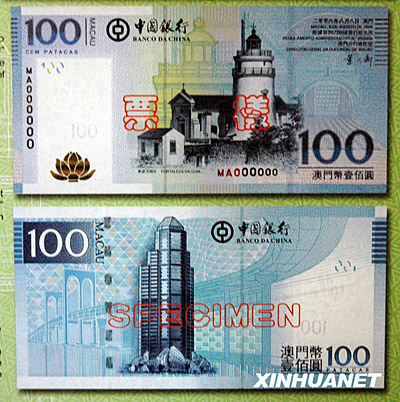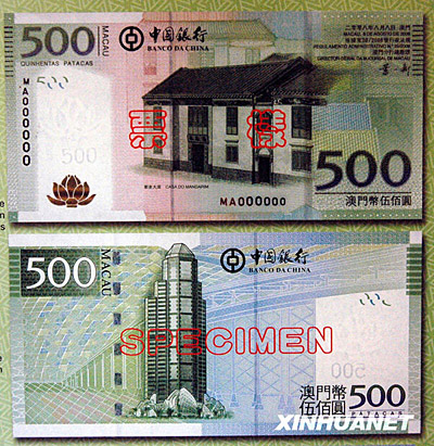 圖為中國銀行2008年澳門元新版鈔票1000澳門元票樣。1000澳門元鈔票的正面主景圖案為民政總署大樓。
