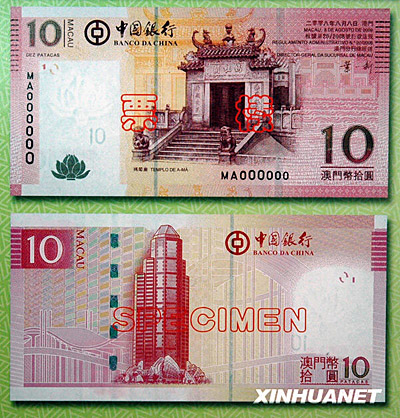 圖為中國銀行澳門元新版鈔票10澳門元票樣。10澳門元鈔票的正面主景圖案為媽閣廟。 |
