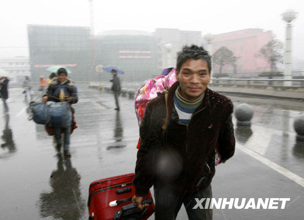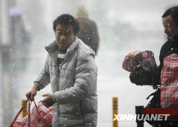 1月6日,一位旅客冒著風(fēng)雪趕往武昌火車站。當(dāng)日,武漢鐵路部門發(fā)送旅客預(yù)計(jì)超過10萬人次,許多旅客冒著風(fēng)雪踏上回家的旅途。