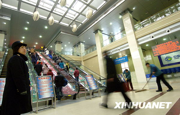 1月7日,一名鐵警在長春火車站候車大廳入口處監(jiān)督。近日,長春鐵路公安處積極部署,實(shí)施全員上崗,加強(qiáng)“三品”(易燃品、易爆品、危險(xiǎn)品)安全檢查,維持車站內(nèi)外秩序,打擊倒票行為,為即將到來的春運(yùn)做好準(zhǔn)備。