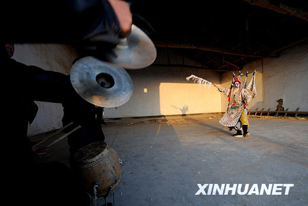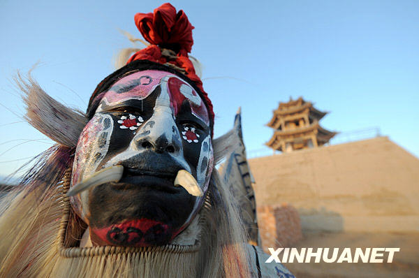 1月7日,高臺縣羅城鄉(xiāng)紅山村村民、48歲的藺耀宗在進行秦腔獠牙特技表演。