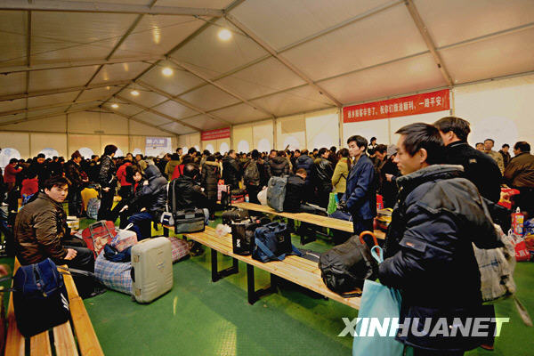 1月10日,旅客在杭州火車站“春運(yùn)大棚”候車。當(dāng)日,杭州火車站新建的兩座春運(yùn)候車大棚正式啟用?偯娣e1500平方米的大棚內(nèi)配有照明、保溫、座椅和開水供應(yīng)等設(shè)施,讓候車旅客免受嚴(yán)寒之苦。據(jù)介紹,杭州火車站和杭州火車東站首次在車站廣場搭建“春運(yùn)大棚”,新增候車能力6000人。