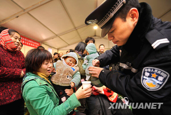 1月10日,杭州火車站派出所民警余鵬在“春運(yùn)大棚”里為候車旅客倒開水。