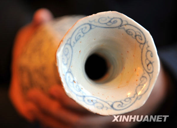 1月10日,一位民間收藏者在展示元青花八方玉壺春瓶,該瓶瓶口卷草紋飾線條流暢自如。