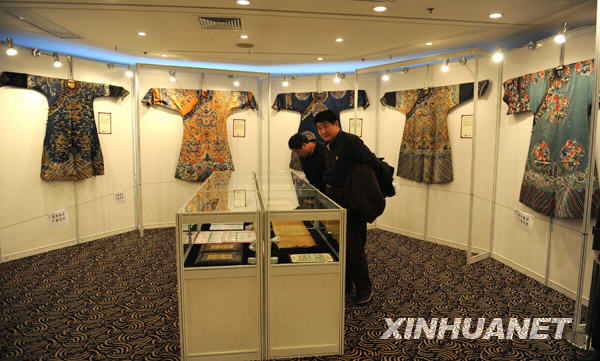 1月14日,來賓在預展上觀賞拍品。當日,北京北緯四十度大成國際拍賣公司(北緯拍賣)在北京舉行新聞發(fā)布會暨拍品預展,宣布包括30件清宮龍袍在內(nèi)的40件珍貴宮廷藝術精品將在1月16日舉行的北緯首拍會上進行拍賣。
